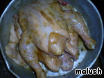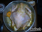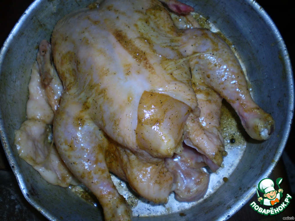 Ну, естественно, первым делом надо «депилировать» нашу курочку и вымыть. Затем натереть солью, перцем, куркумой с подсолнечным маслом. Кладем курицу в форму