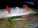 В надрезы вставить, чередуя, лимон с помидором. Вовнутрь положить лавровый лист и укроп. Выложить на противень и - в духовку при 150*С приблизительно на 20 мин.