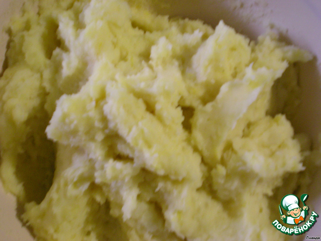 Почистить картофель, отварить его до готовности. Воду слить, размять в пюре. Охладить. Взять 400 г готового пюре, добавить в него 25 г мелко натертого твердого сыра (я брала "Российский"), 3 ст. л. муки, сырой желток, соль и немного куркумы для цвета.