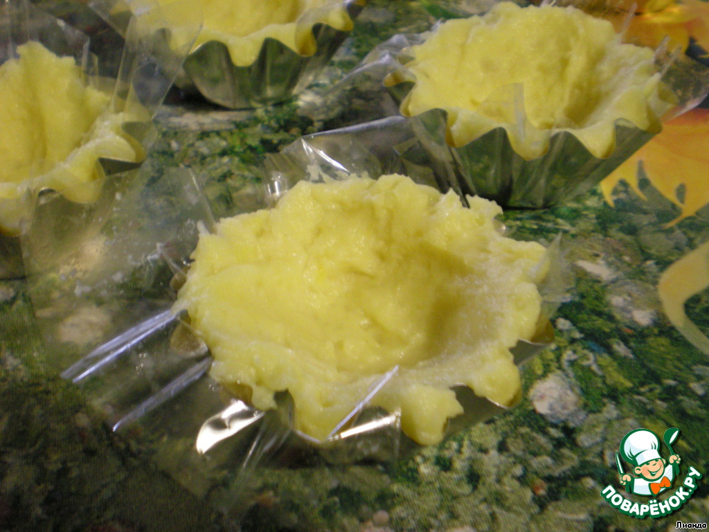 Взять формочки для кексов, наполнить их тестом-пюре так, чтобы получилась корзинка. У меня "вредные" формочки, поэтому я подстелила рукав для выпечки, разрезанный на квадратики. Пленку обязательно смажьте растительным маслом. Тесто распределяйте мокрыми руками, тогда оно не липнет к рукам.