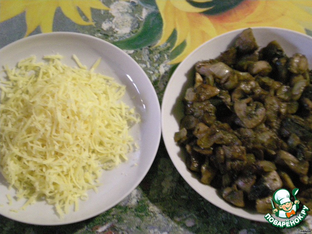 Приготовьте начинку. Грибы некрупно нарежьте, лук измельчите. Поджарьте на растительном масле до готовности. Посолите, положите укроп.