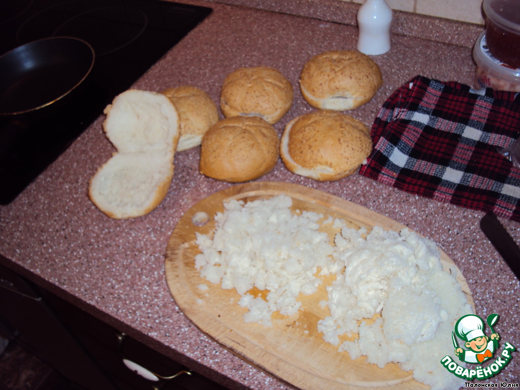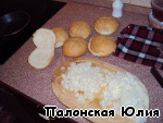 Берем булочки и осторожненько срезаем крышечки (не полностью, как на картинке) вынимаем мякоть. Булочки убираем в сторону. Берем мякоть, мелко режем ее ножиком и крошим.