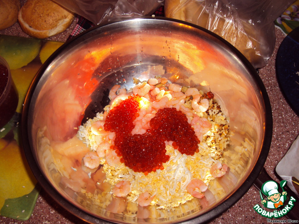 Теперь режим мелко вареные яйца, смешиваем с сухариками, добавляем креветки, икру. Смешиваем все с майонезом. Начинка готова! -