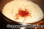 Для начала варим рис. У каждого из вас наверняка есть свой способ приготовления рассыпчатого риса. Я готовлю максимально просто: заливаю промытый рис кипятком (в объёме в 2 раза большем, чем объём риса), довожу до кипения, убавляю огонь и накрываю крышкой. Минут через 15 рис впитает всю воду и будет готов. В данном блюде за 5-7 минут до готовности риса всыпаем в него шафран и перемешиваем.