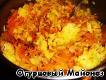 Добавляем морковно-луковую зажарку к рису и перемешиваем.