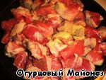 Следующим действием раскладываем кусочки мяса по порционным мини-кастрюлькам (кокотам).