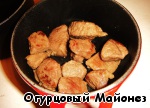 Теперь режем баранину небольшими кубиками и обжариваем до готовности на той же сковороде, где готовили лук с морковью. Солим по вкусу и посыпаем молотым чесноком.