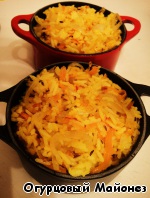 Сверху засыпаем рис с овощами и поливаем сверху ещё немного оливковым маслом. Накрываем крышечками и ставим на 15 минут в разогретую до 200 градусов в духовку.
