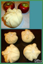 Яблоки, каждое по 220 г. Серединки удалить. Из теста сделать четыре одинаковые булочки. Каждую раскатать.