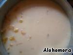 И делаем пропитку, вернее не пропитку, а вот такую штуку: жидкость с персиков сливаем в кастрюльку, добавляем лимонный сок, крахмал (те пол чайной ложечки), размешиваем и нагреваем на слабом огне до загустения. Вот!