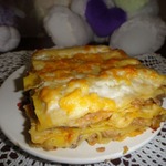 Далее: после смазывания соусом кладем тесто, суго, соус, тeртый сыр. Сделать ещe два слоя. Венчает лазанью слой теста, посыпанный тeртым сыром и политый соусом бешамель. Запекать лазанью нужно в нагретой духовке при 180 гр. С 45 – 50 минут, до появления аппетитной корочки. Если тесто делаете сами, то лучше его разрезать на квадратики: так удобнее варить. А потом просто выстилать из квадратиков слой. Варится тесто очень быстро, как только всплывают квадратики, я их вынимаю и в форму, на их место - новые, а эти закрываю начинкой. И так вот по конвейеру. Вообще лазанья делается быстро. Минут 45 уходит на всe. Время, что лазанья проводит в духовке, не считаю.