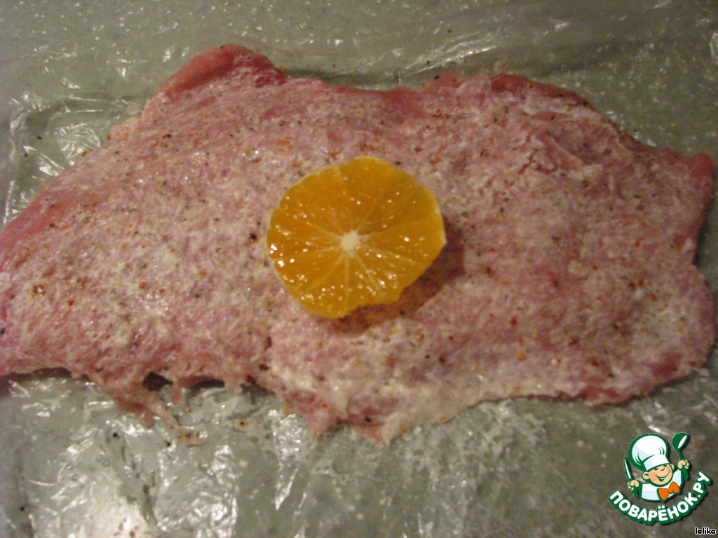 • Вновь займемся мясом. Чистим тщательно апельсин и режем его на 4 толстые дольки