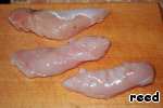 Куриное филе помыть, обсушить полотенцем. Нарезать на небольшие ломтики. Посолить и поперчить.