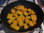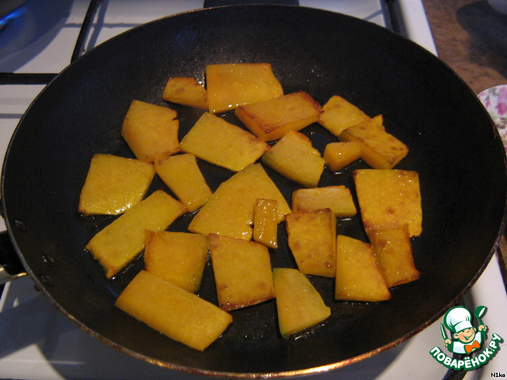 1. Тыкву, очищенную и нарезанную ломтиками, обжарить в подсолнечном масле до золотистого цвета.