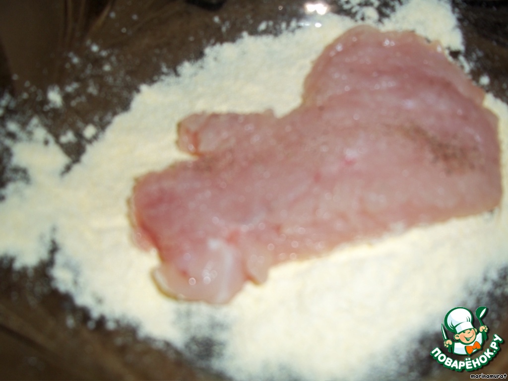Отбиваем мясо тупой стороной ножа, солим и перчим, обваливаем в муке.