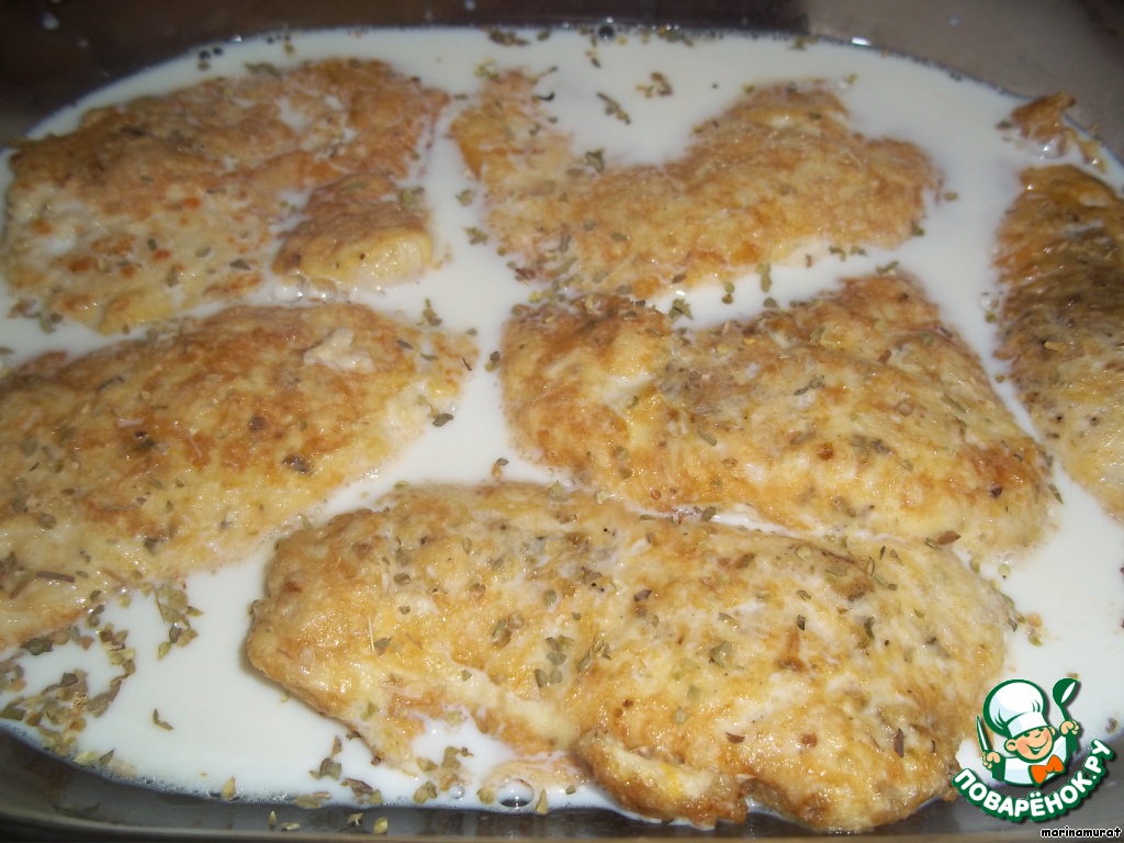 Кладем филе в форму для запекания, заливаем молоком до половины и ставим в разогретую до 180 градусов духовку до выкипания молока. Можно и в сковороде с глубоким дном. Не забываем накрыть крышкой!