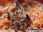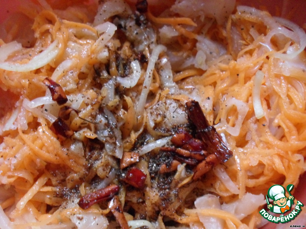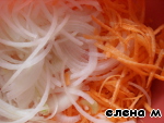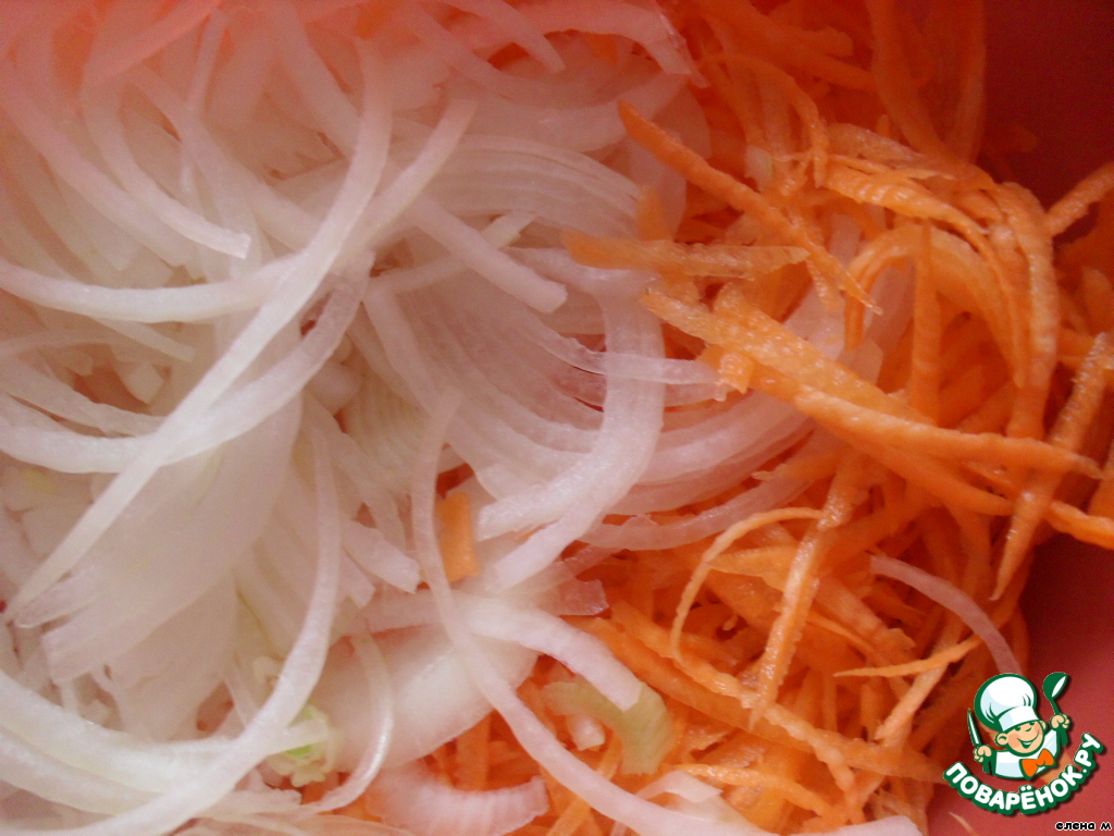 Лук нарезать тонкими полукольцами, морковь натереть на терке для корейской моркови.