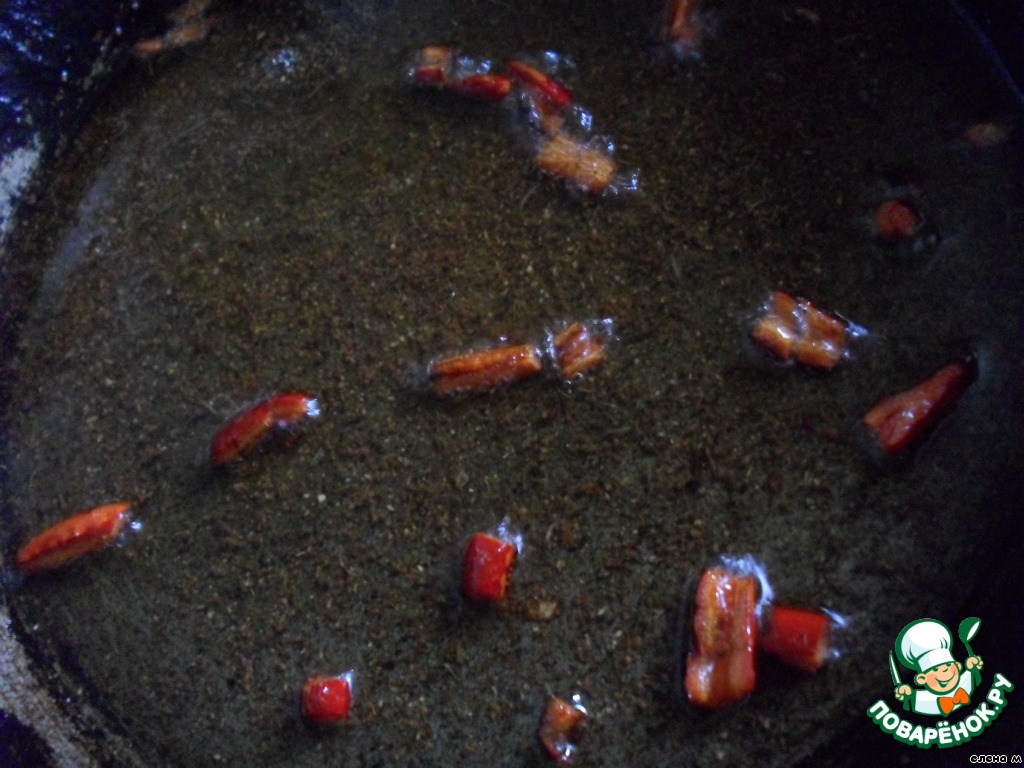 На сковороде разогреть растительное масло, почти до дыма, добавить нарезанный острый перец, кориандр, черный перец, чеснок или чесночную соль. -