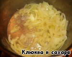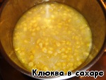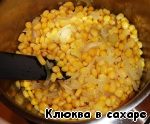 Как только лук стал прозрачным, добавляем кукурузу и обжариваем всё вместе минут 5-7. Жидкость из банки с кукурузой надо слить в отдельную посуду (она потребуется позже).