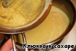После этого измельчаем содержимое кастрюли блендером до однородной массы. Добавляем жидкость, которую мы слили из банки с кукурузой. Если её слишком много, то всё добавлять не надо, примерно трёх столовых ложек будет достаточно.