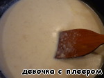 В сковороде растопите сливочное масло, добавьте муку, перемешайте. Затем влейте молоко и бульон. Варите до закипания.