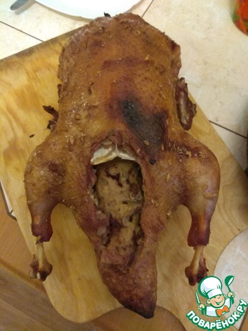 Утку режем, достаем из нее начинку, режем начинку на кусочки и угощаемся!