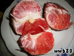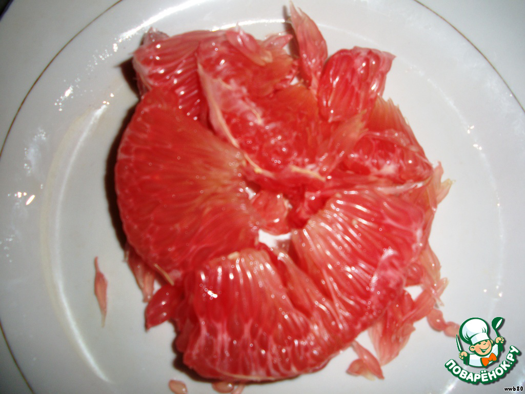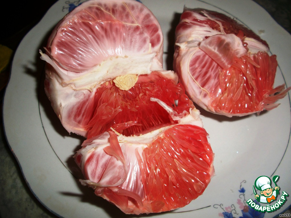 Недавно муж принес домой помело. С недельку оно лежало без дела в холодильнике. И вот, наконец, я решила из него что-нибудь приготовить. Получился очень даже вкусный и красочный салатик.