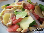 Смешать курицу, салат, помело, сыр, орехи кешью, добавить оливковое масло и соль. -