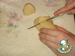 Каждый кусочек обвалять в муке, раскатать в тонкую лепешку