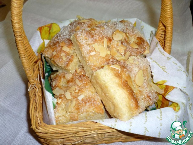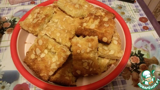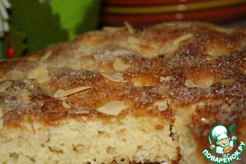 Миндальными лепестками. Думаю, что без ущерба для вкуса можно заменить последние на миндальную крошку. Накрыть противень с пирогом полиэтиленовой плёнкой и оставить для второго подъёма на 20-30 минут.