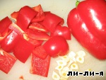 Красный сладкий перец (очищенный от семян) нарезать на крупные кусочки.