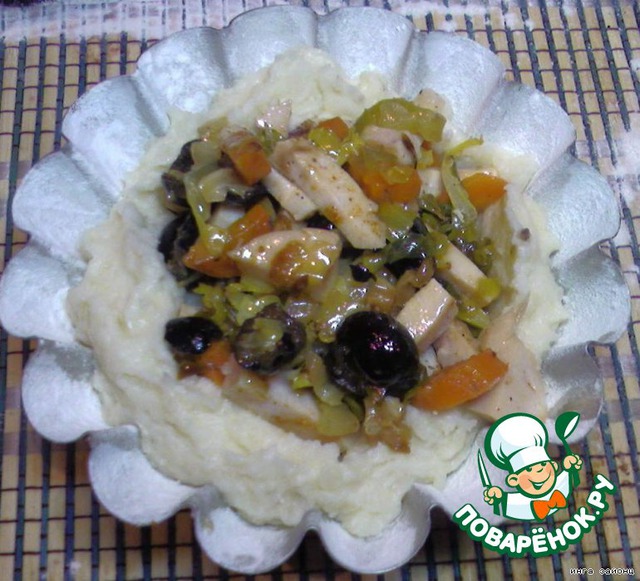 Форму смазать маслом, щедро присыпать мукой. Выложить часть картофельного пюре сверху начинку и закрыть второй частью пюре.
