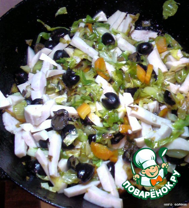 К овощам добавить маслины и нарезанную довольно крупными брусочками ветчину. Все вместе протушить еще минутку и остудить.