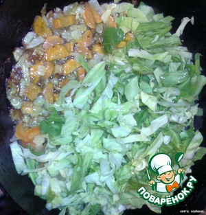 Поджарить лук с морковкой. Добавить мелко нашинкованную молодую капусточку. Потушить