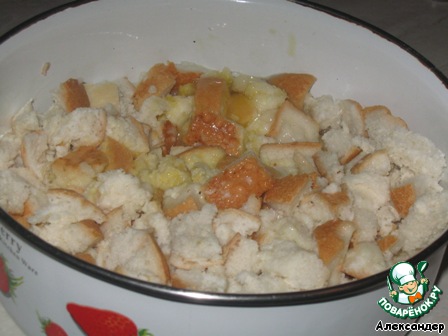 Булку порезать кубиками, добавить яйцо, молоко. Дать постоять минут 20.