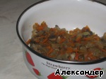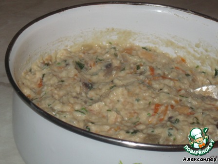 Приготовить начинку. Порезать мелко грибы, лук, морковь и обжарить на раст. масле до готовности.