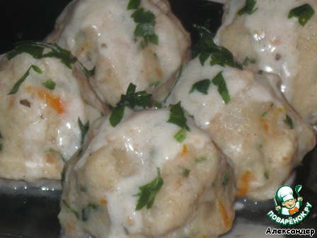Готовлю это блюдо впервые. Мягкие, воздушные шарики с начинкой из грибов, моркови и лука. Для разнообразия попробовать можно. Решающую роль в этом блюде играет соус. У меня молочно-сметанный с грибным вкусом. Блюдо довольно универсальное: можно есть с бульоном или в качестве гарнира на второе. Учитывая самый простой набор продуктов, при желании повозиться вполне можно поэкспериментировать.