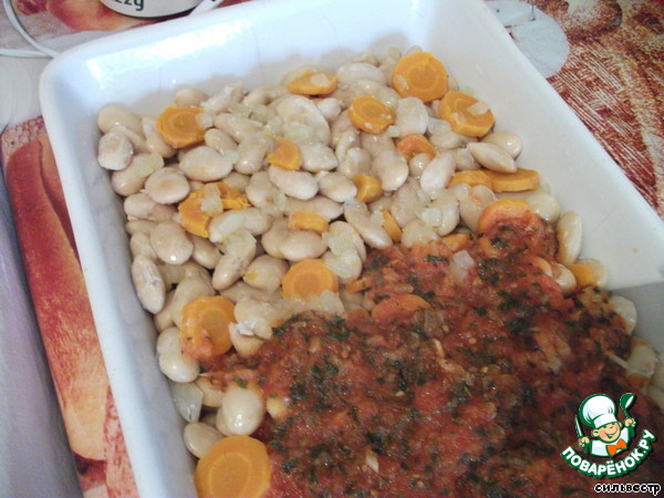 Отцеживаем фасоль, выбрасываем перец, сельдерей и (кто не любит) вареную морковь. Я морковку нарезала и добавила в фасоль. Выкладываем все в форму для духовки.