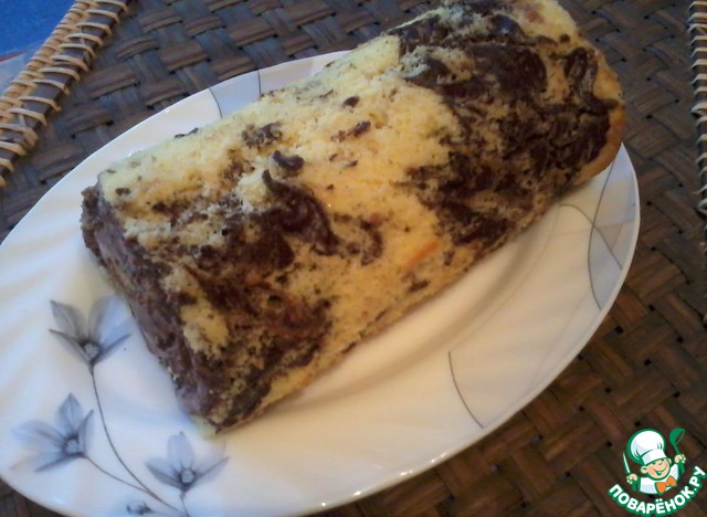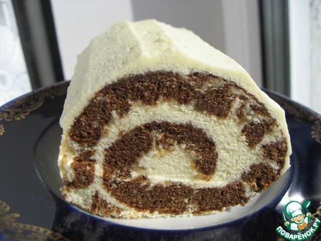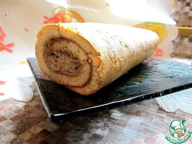 Раскатали рулет, убрали полотенце, размазали крем по бисквиту и снова скрутили в рулет.