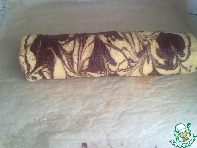 Готовый бисквит на противне накрываем влажным полотенцем и переворачиваем противень на полотенце, скручиваем, даём минут 5 постоять.