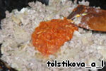 добавляем готовый фарш, соль, перец, 2 ст. ложки творога, измельченные помидоры -