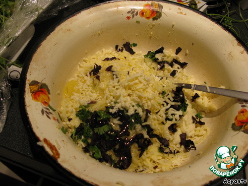 Пока подходит тесто, готовим начинку. Натираем сыр на терке, добавляем нашинкованную кинзу, базилик и яйцо. Все перемешать. -