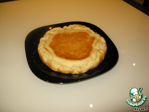 После того, как тесто подошло, делим его на две части и раскатываем в две лепешки. Первую лепешку выкладываем в форму для запекания (я все готовила в мультиварке, поэтому выложила в форму, которая там), на неё начинку, сверху закрываем второй лепешкой, скрепляем по бокам.