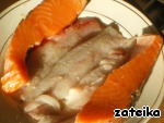 Рыбу (я имею в виду сибаса) почистить (удалить голову, внутренности и т.д.), вымыть и… можно на этом остановиться, просто разрезав рыбу на порционные куски. А можно продолжить, а именно, «добыть» филе, разрезав рыбу по хребту и удалив кости. На этом опять можно остановиться, опять-таки разрезав филе на порционные куски. Но мне хотелось «красиво», поэтому с филе срезаем аккуратно кожу. Процесс добычи филе не снимала, извините, поскольку с рыбой в этом смысле я «на Вы», и на кухне крутился мой детеныш, пытаясь стащить со стола все равно что: нож, кусок филе или хотя бы шкурку от семги.