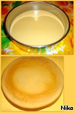 Форму смазать любым маслом и тесто для бисквита вылить в неё. Бисквит разрезать на два коржа. (Я не ждала когда он остынет...)