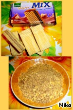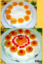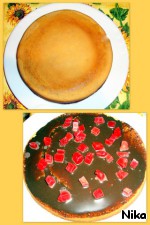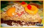 Этот тортик я сделала в этот же день, сразу после ухода подруги. Наши посиделки затянулись, не заметив как, но мы съели весь тортик. Мои взрослые "маленькие" сыновья возмутились, что я им не оставила даже попробовать... Я проделала всё тоже самое и с этим тортиком. Но на крем яиц не хватило. Верхний корж пропитала сиропом из компота. Обсыпала тёртыми шоколадными вафлями. Выложила в таком же порядке абрикосы и цукаты.