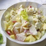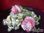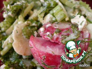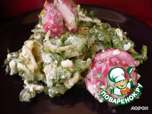 Добавить в заправку сельдерей, редиску, яблоко. Перемешать. Дать постоять 10 минут и можно пробовать.