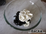 Чернослив помыть, нарезать и положить в мисочку. Следом добавить творог, хорошенько перемешать.