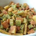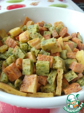 Достать из духовки, дать остыть и разрезать кажддый пласт на кубики 1 х 1 см (не больше, потому что при варке кубики увеличатся примерно в полтора раза).