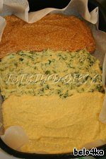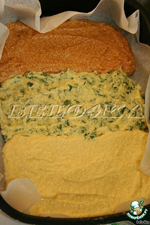 Выложить в форму, застеленную пекарской бумагой (у меня размер формы 21 на 28 см), слоем примерно 1 см. Тесто довольно густое, слои не смешиваются.